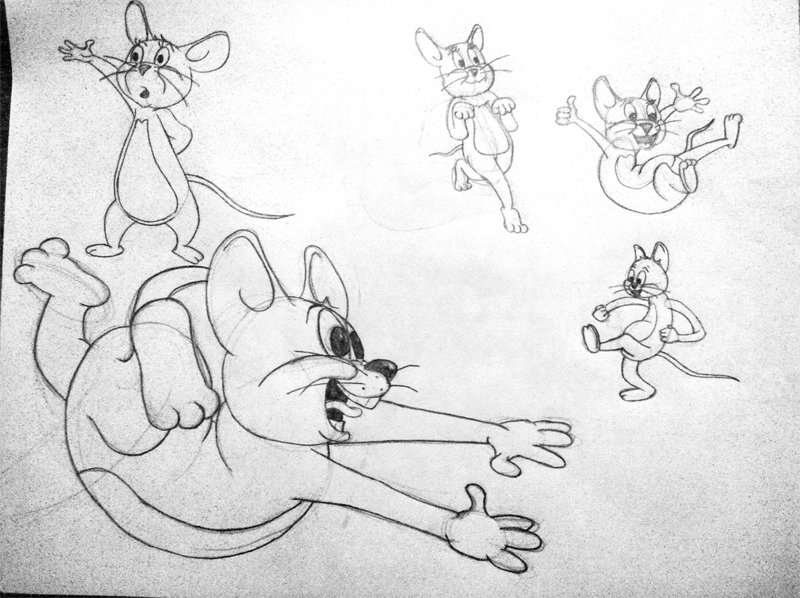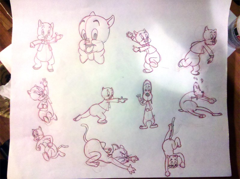 I drew characters in poses of my own design (no copying). I began with the line of action and worked through construction. John Kricfalusi recommends that I stick with good generic characters like Tom and Jerry, Porky Pig, or Elmar Fudd. The reason behind constructing my poses from these characters is because they are clean yet solid with minimal complexity. This means that during the exercise, I will be able to focus on construction and creating my own poses.