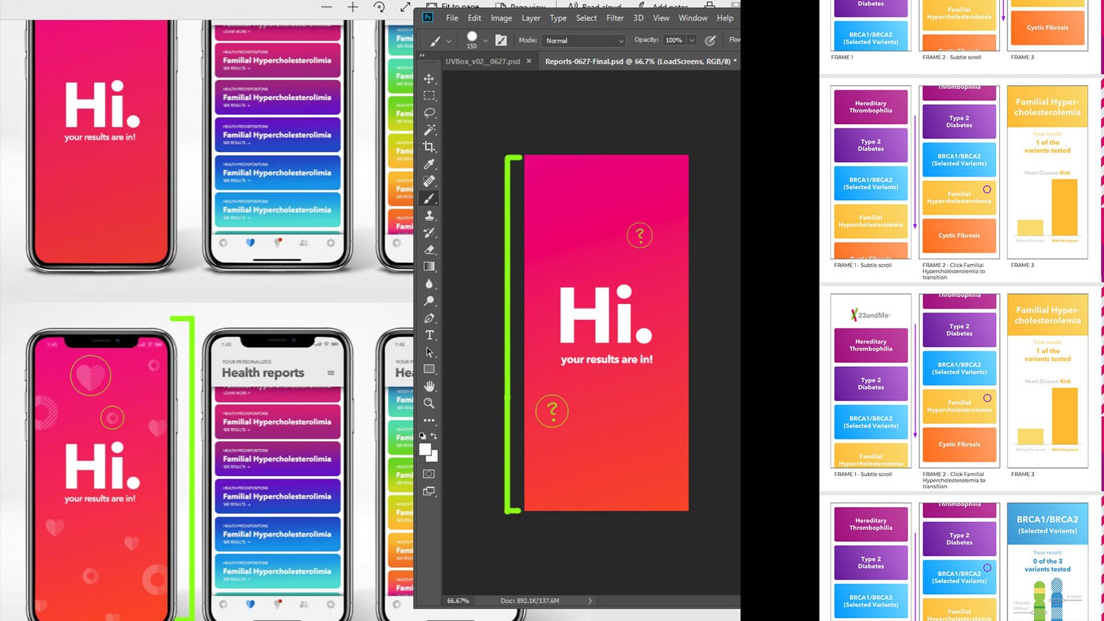 For 23 & Me’s series of commercial spots promoting their app, I created the photo-realistic graphic spots highlighting the various UI and use-cases for 23 & Me. It was a fun project that I enjoyed working on.