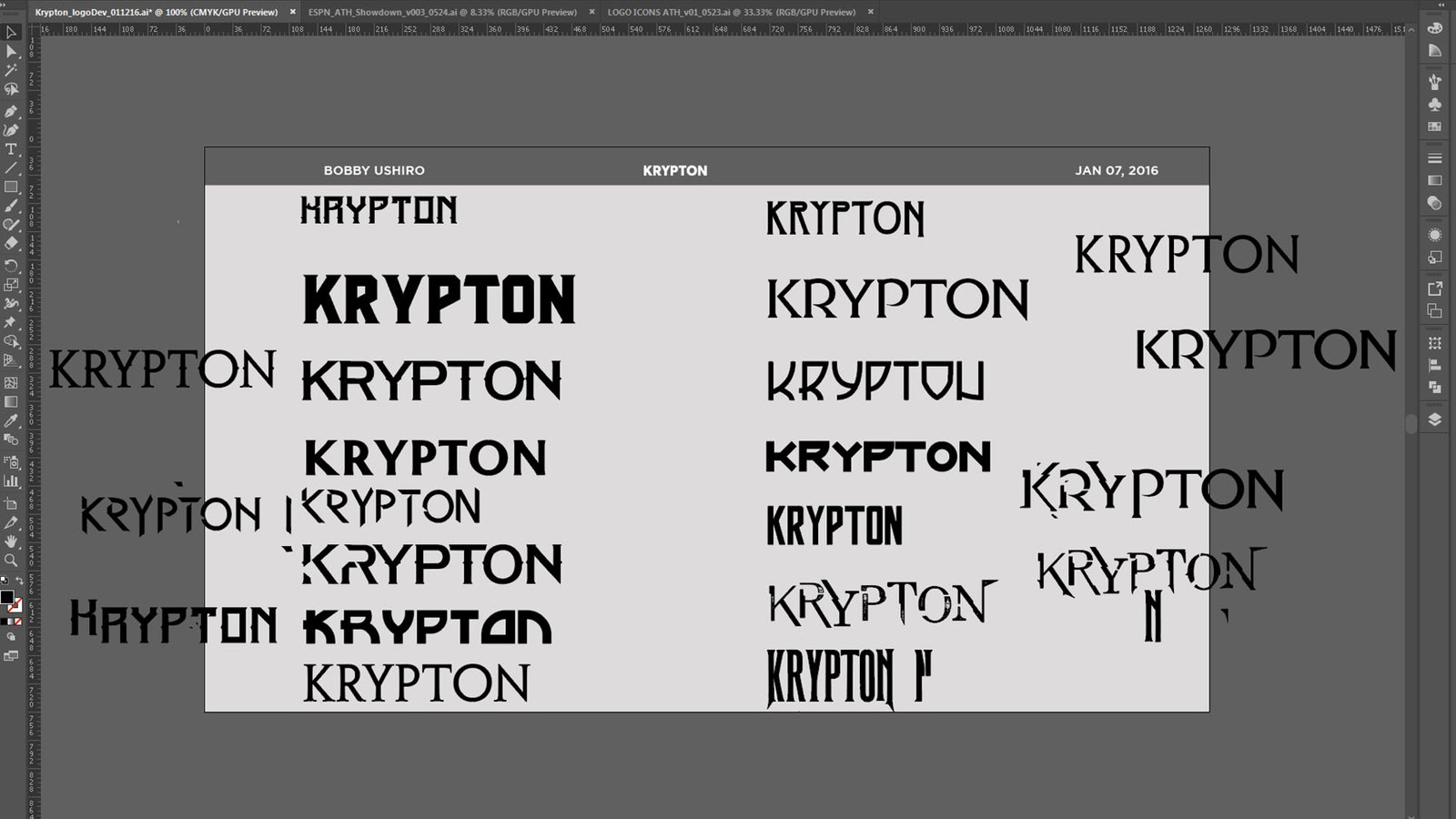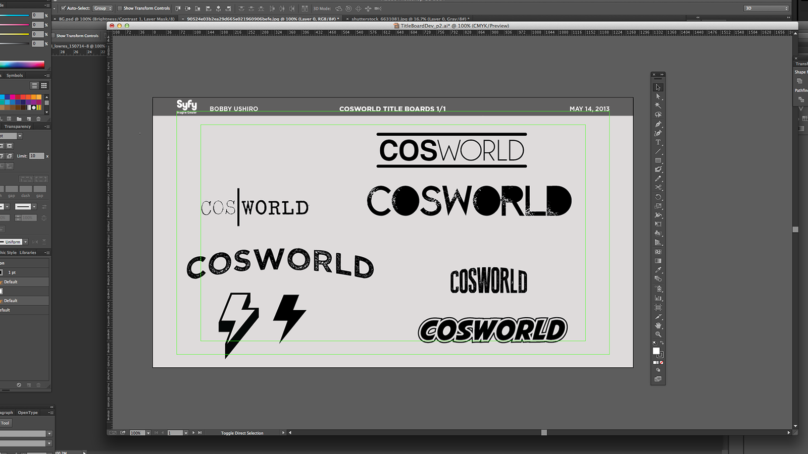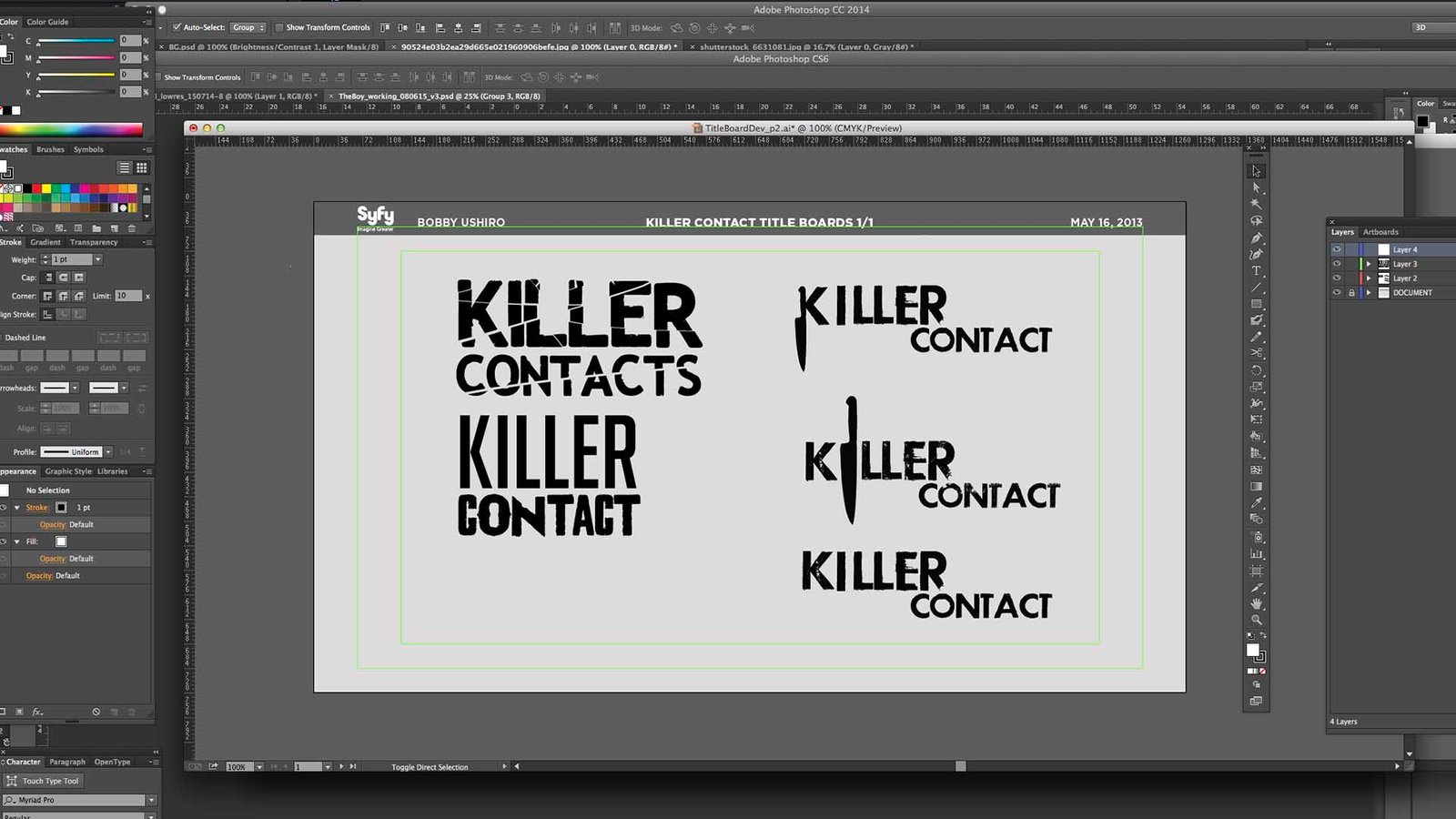 Here are a few logo design process shots that I’ve worked on. The first thing that we approach when designing a show package is to design the show logo. This is a crucial yet under-appreciated process in establishing the look and tone of the show. The logo needs to work in a variety of settings whether it’s across digital, print, 2nd or 3rd screen; logo’s need to stand on their own and need to be robust and distinct enough to carry the ‘brand’ of a show. It’s not rocket-science, there’s just a process that needs to happen in order to eliminate the traps of low-hanging fruit to choose a logo that is specific and unique to the show, this is especially true in today’s scattered screen environment where often-times a show-logo is the only graphic that a viewer will see to interface with the ‘brand’ or show. The process usually involves reading a series overview, scripts, watching any footage that’s available, in the end I always design with an idea of how the logo can animate which helps inform the boarding process.