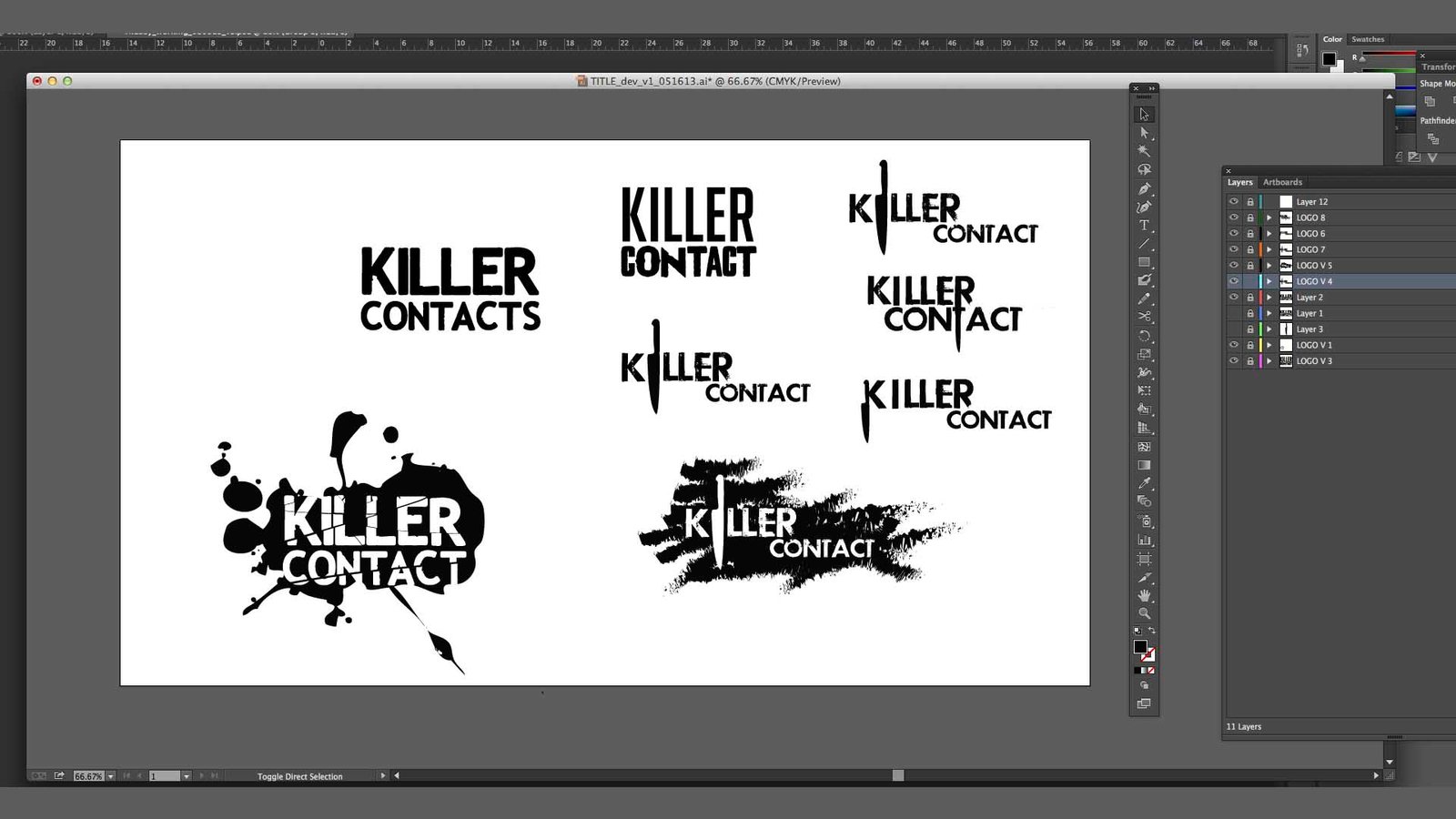 Killer Contact process frames. Logo development. As we went through rounds, it soon became clear that the SVP wanted to incorporate a knife into the logo to connect the idea of serial killers since Killer Contact could we construed in different ways. Additionally from a design perspective, I was already thinking of ways to incorporate the knife into the logo reveal.
