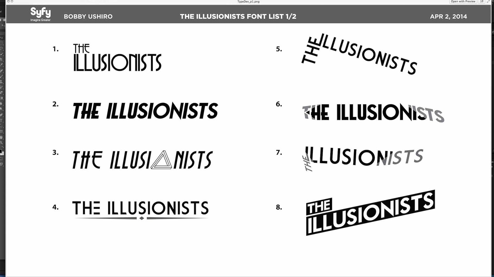 The Illusionists was a reality show about the market for cutting-edge magic tricks. This team of magic experts travel America seeking out the newest and most-awe inspiring tricks, usually if it’s a trick that impresses them, the team will make a deal to acquire the rights to the trick and give the client a percentage of the sales. You can think of the Illusionists as David Blaine meets Pawn Stars. A lot of logos were designed for this show, I felt that magic + illusions was something I could take advantage of to come up with a clever show package, alas the show was ultimately killed because it was felt we already had a magic show in Wizard Wars and Troy: Street Magic.