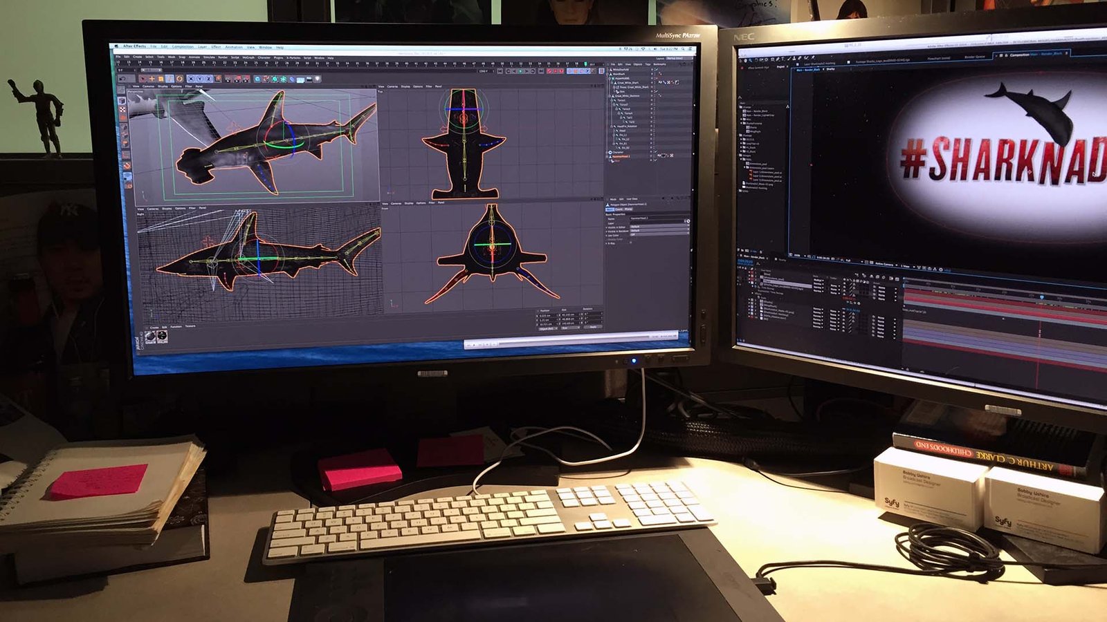 Sharknado is a made-for-tv schlock-disaster film about a cyclone that sucks sharks out of the ocean to become a terrible shark-tornado that ravages various locales. The movie has re-curing stars Tara Reid and Ian Ziering. I remember the regular morning at the office where we were going over Syfy Original Movies, and we decided to send the Sharknado packaging out of house since our bandwidth was full and I was already working on another original film. The projections I worked on for the Comic-Con party was for Sharknado 2: The Second One and Sharknado 3: Oh Hell No!