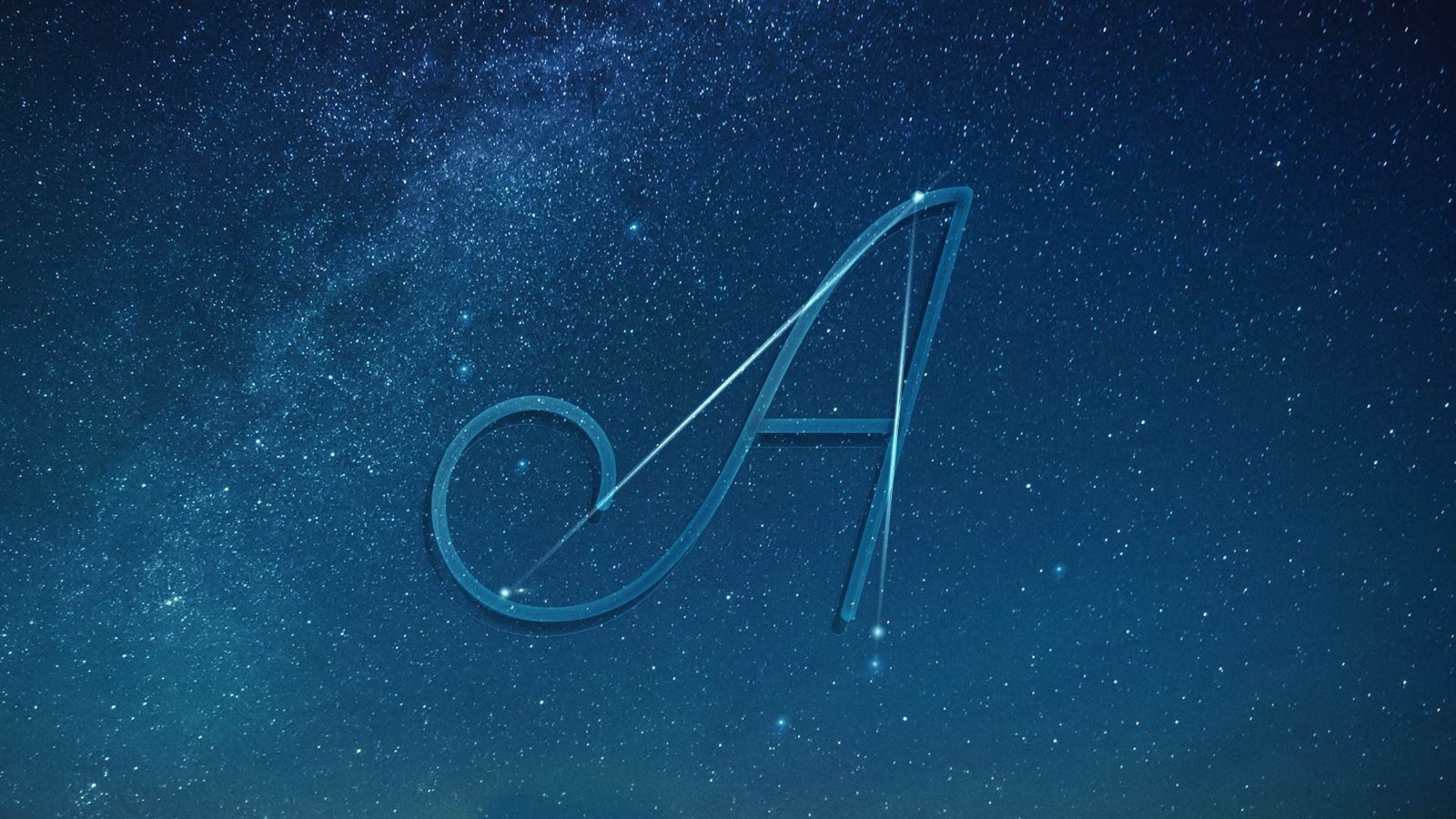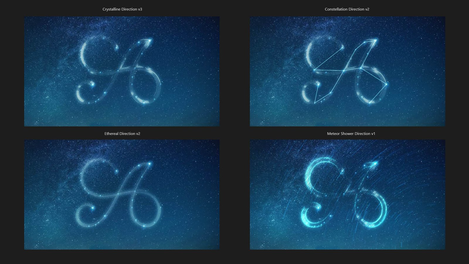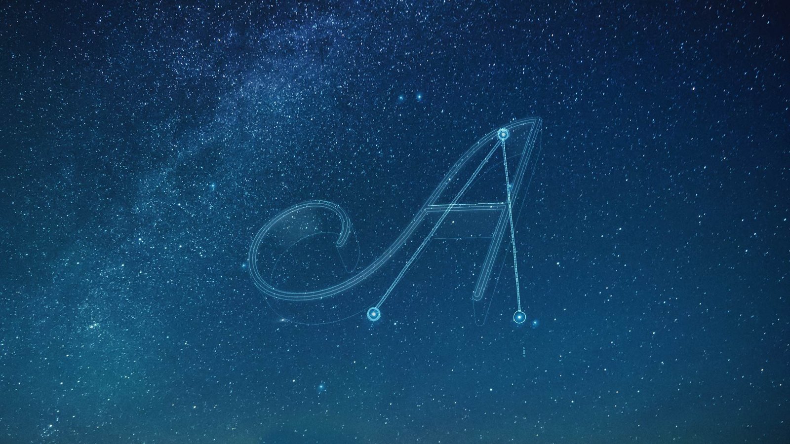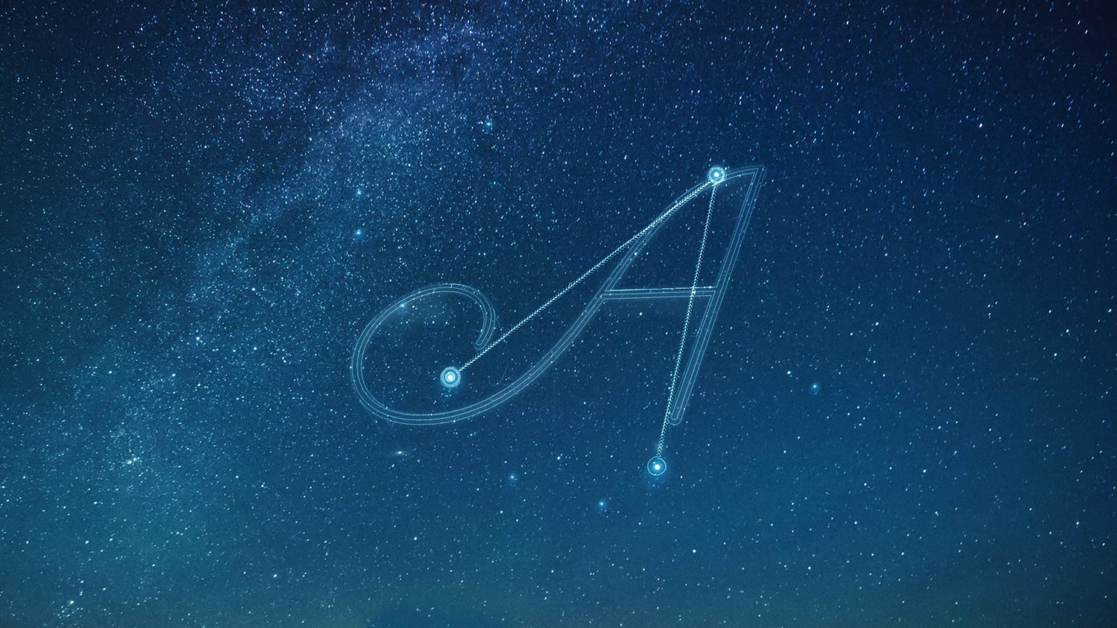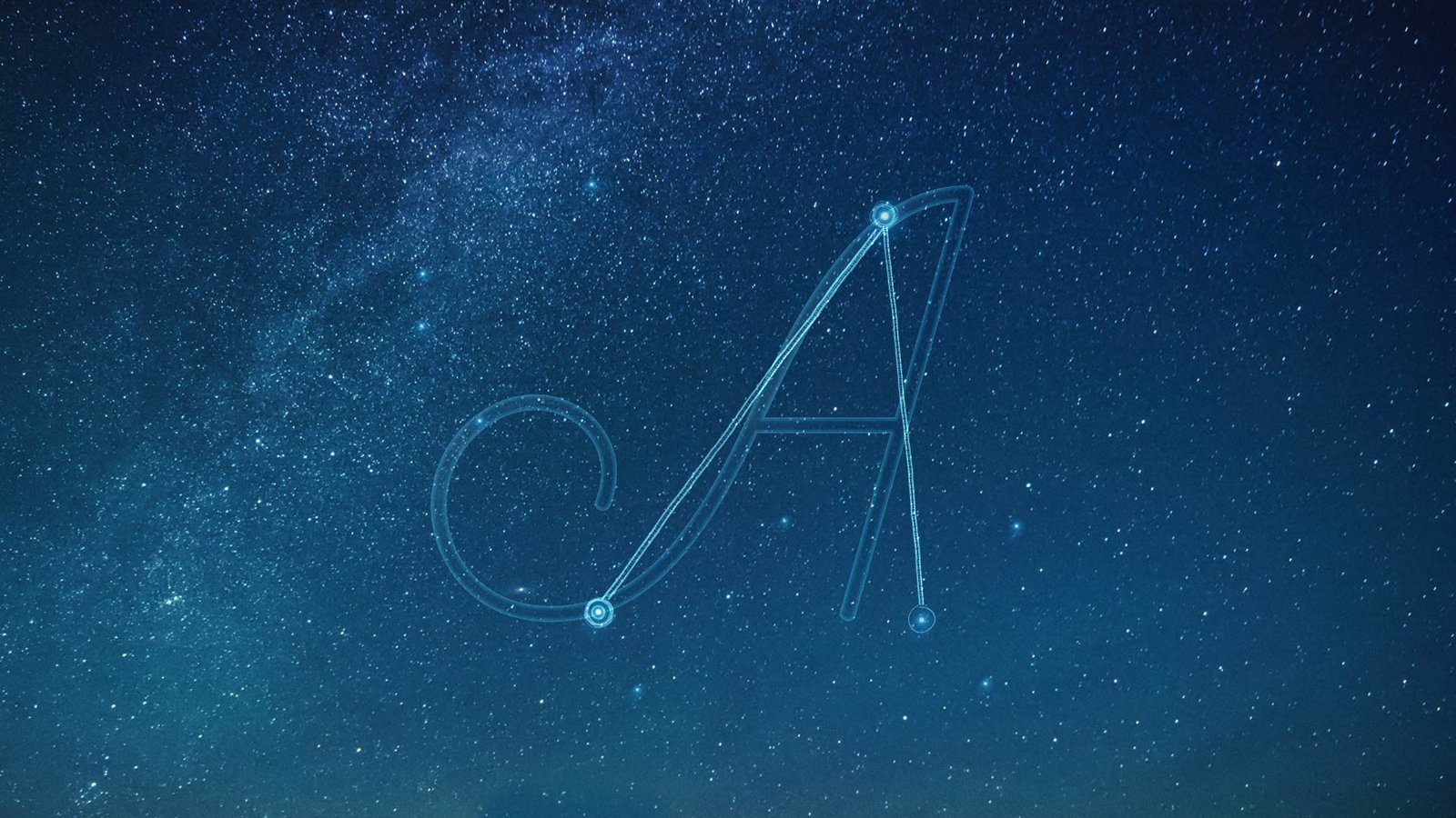 Here’s a screenshot of some iterations for the letterform A, treated with different star constellations and letterforms. We did dozens of these treatments for each letterform used in the spot.