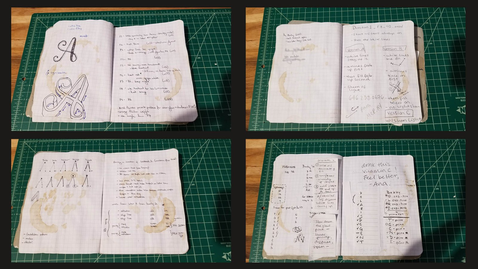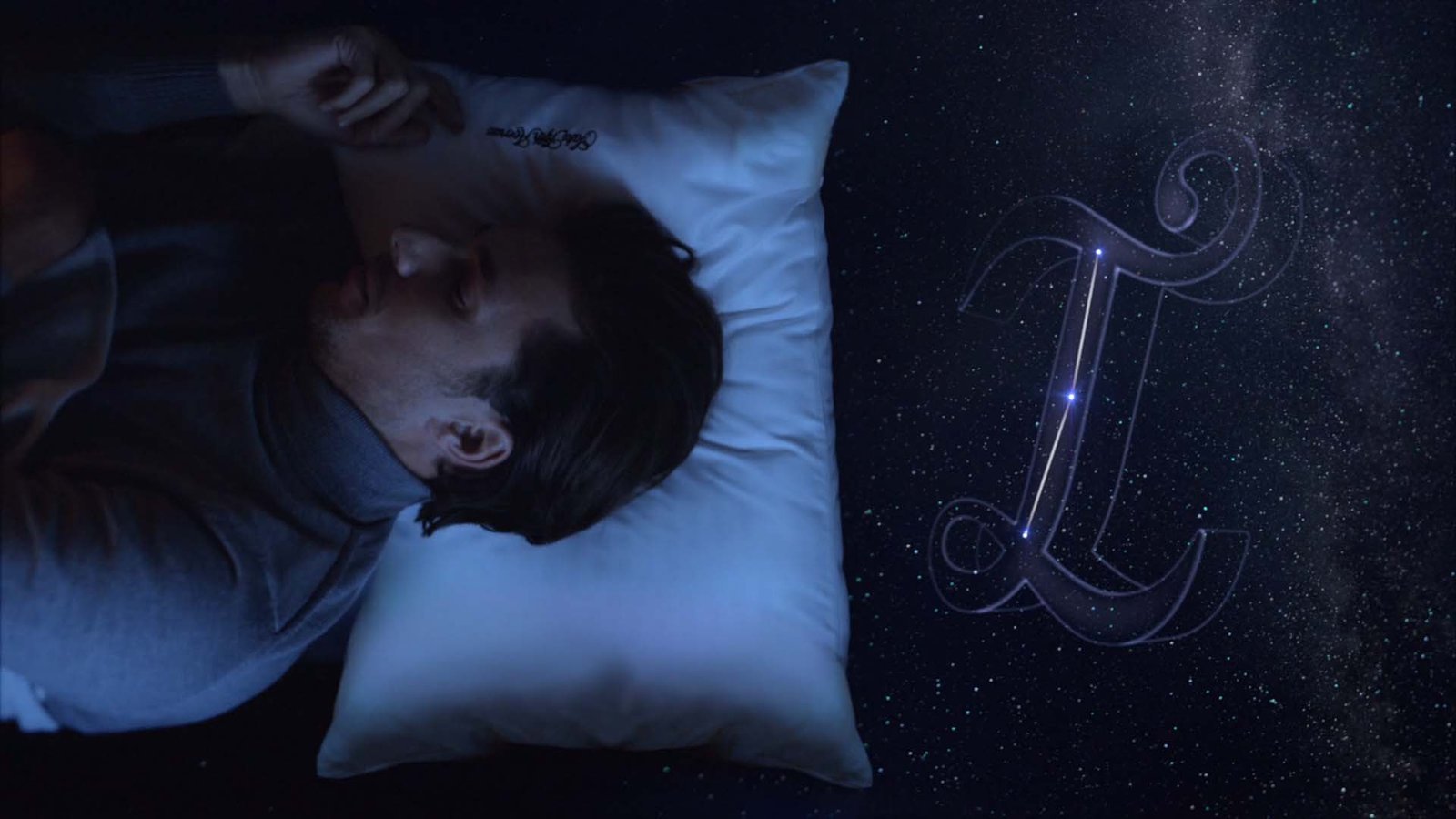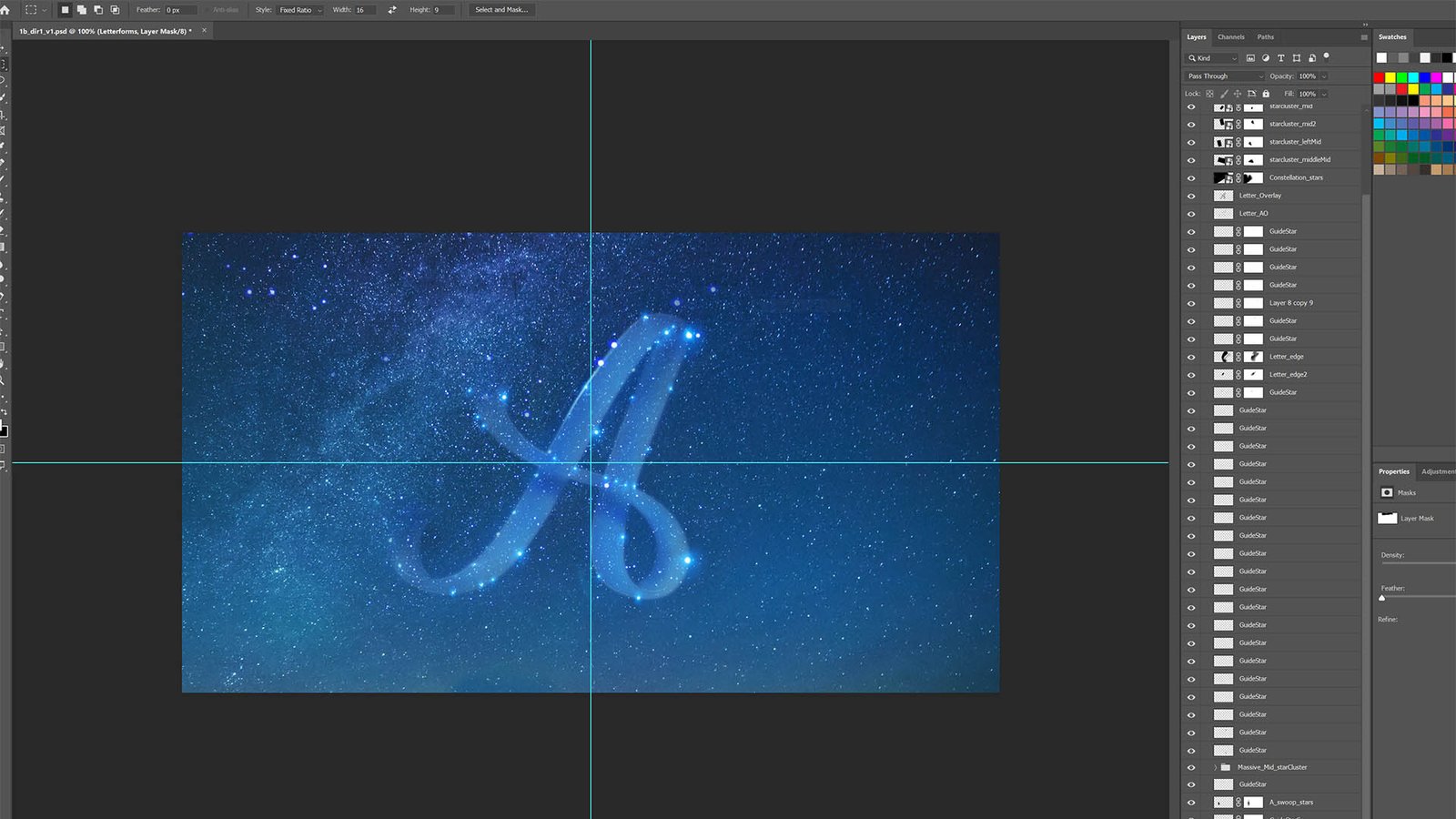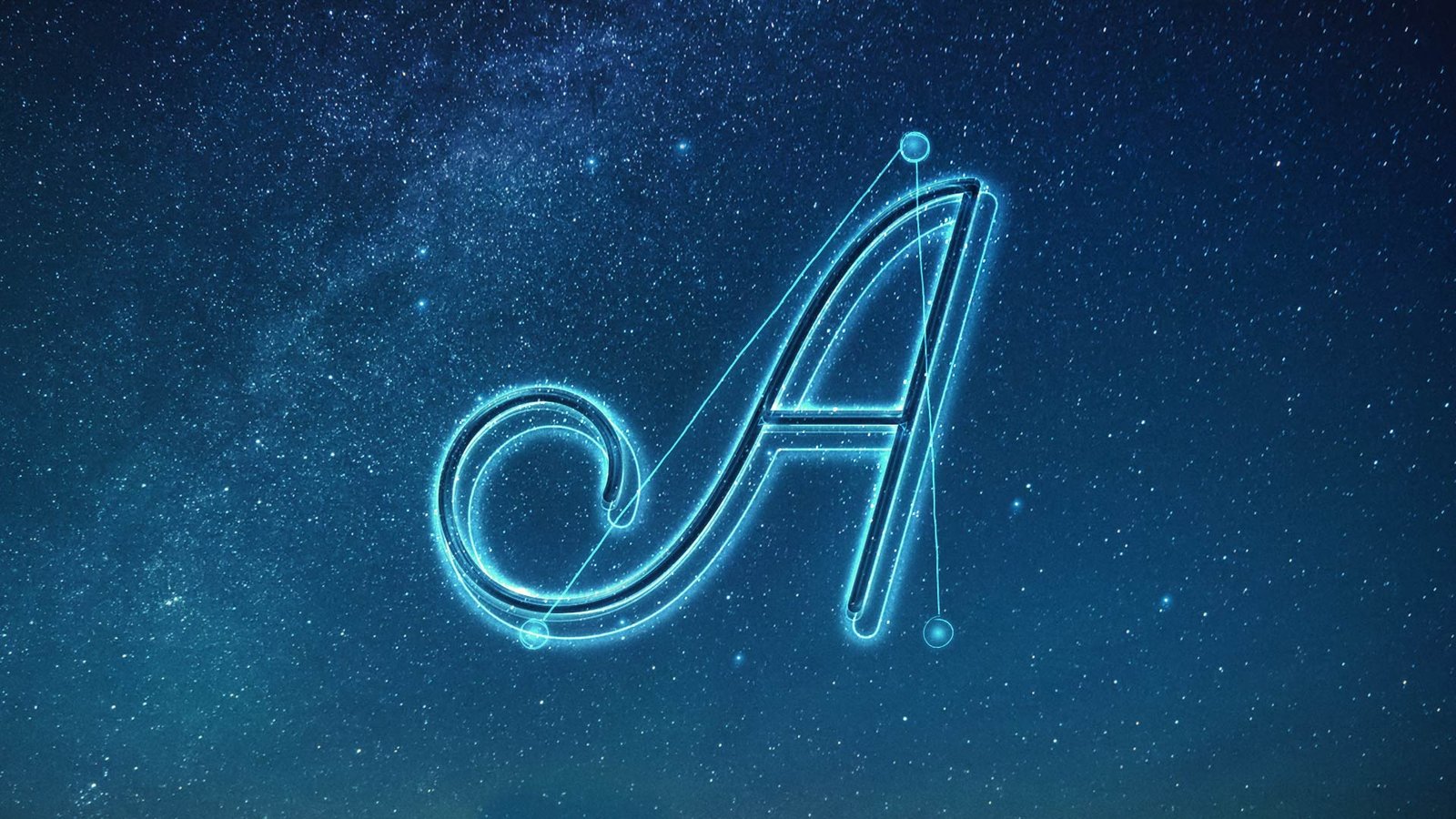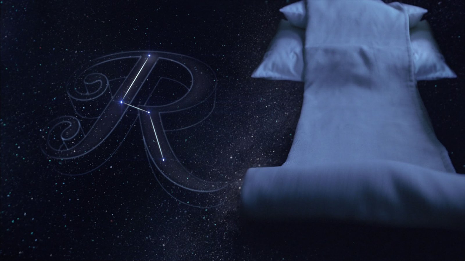 Here’s a screenshot of some iterations for the letterform A, treated with different star constellations and letterforms. We did dozens of these treatments for each letterform used in the spot.