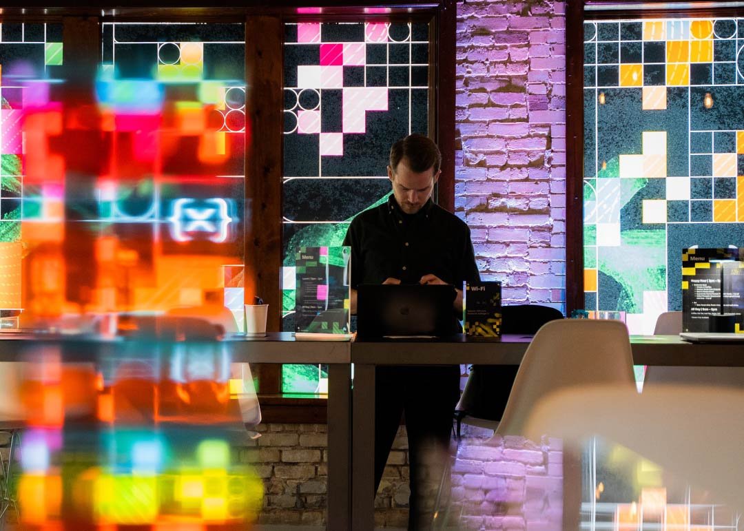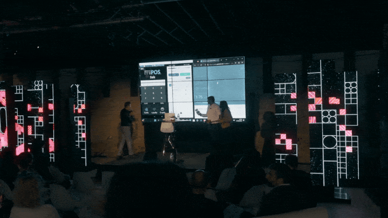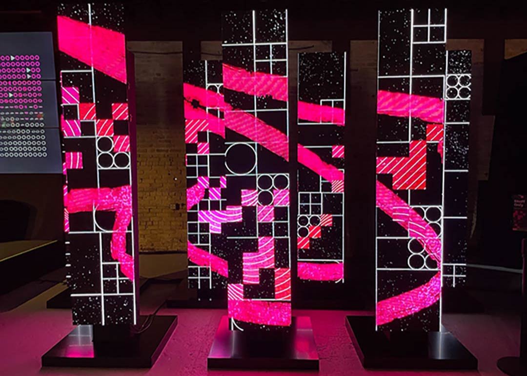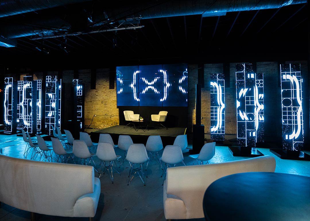 At the entrance, there is a captivating art installation created using a live ledger. It serves as both a visual centerpiece and an opportunity for taking memorable photos. Additionally, the installation acts as a backdrop for various programming events. When not in use, a large wall-mounted screen is connected to the live-ledger display, providing a dynamic platform for programming activities.